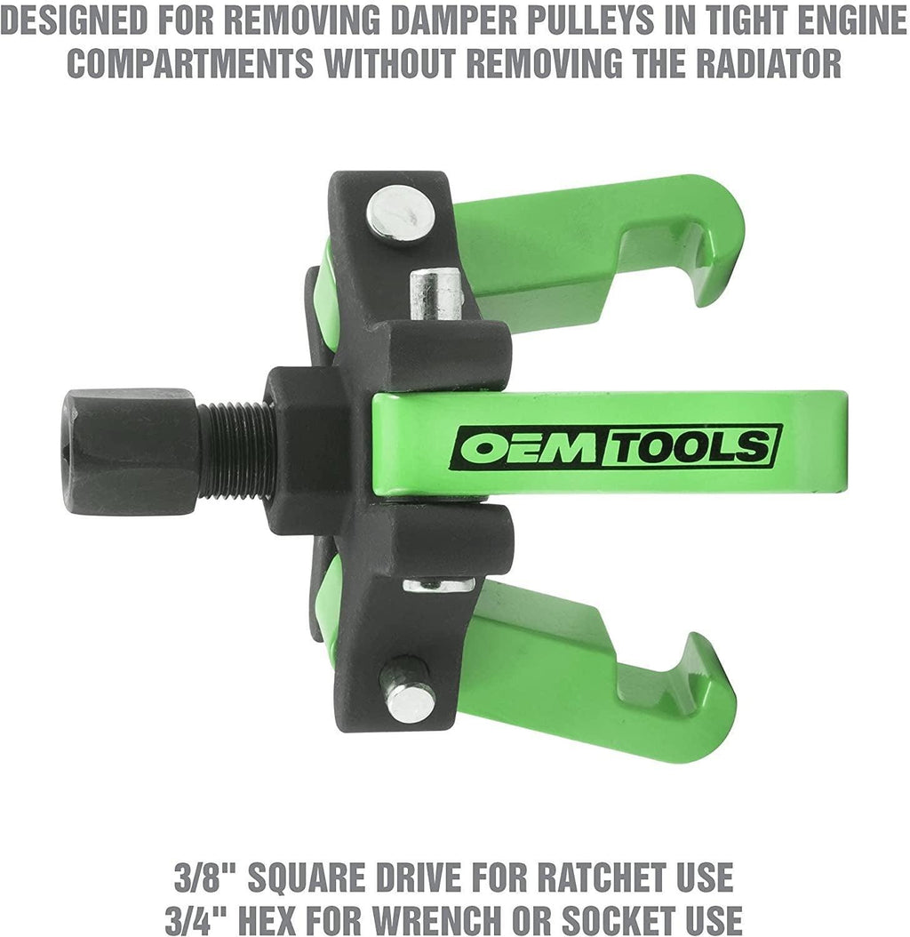 The OEM TOOLS Harmonic Balancer Puller is designed for use with Model GM 2000, Generation II Cadillac (1988 - newer), Chevrolet Trucks (2003 - newer), Chrysler (1990), Ford (1995 - newer), and Mitsubishi Eclipse (1995) vehicles. The harmonic damper puller is designed to remove the harmonic balancer from the engine crankshaft. This crankshaft pulley tool is capable of removing harmonic balancer damper pulleys in tight engine compartments without removing the radiator. Our crankshaft pulley removal tool includes the 3-jaw puller, 4 different lengths of forcing adapter rods, and a forcing screw with a 3/8 inch square drive for ratchet use and a 3/4 inch hex for wrench or socket use. This harmonic balance puller includes unique tensioned jaws for easy tool placement in tight quarters--a feature not offered by other brands. Special jaws engage the spokes of pressed-on harmonic balancers that do not have threaded holes, holding the legs in place when positioning the harmonic puller and making it easier to remove the crankshaft balancer. This harmonic puller kit also comes with a heavy-duty blow-molded carrying case, making it easy to transport our harmonic balancer kit from job to job. To use 1. Lubricate and thread the pressure screw into the puller tool. 2. Using a ratchet remove harmonic balancer’s retainer bolt. 3 Select the appropriate adapter rod. 4. Stick the adapter rod into the center of the harmonic balancer and then put the hollow end of the pressure screw over the adapter rod. 5. Insert the jaws through the spoked areas so they’re gripping the center hub. 6. Hand tighten the pressure screw until it makes contact with the adapter rod. 7. Use a ratchet to turn the pressure screw until the harmonic balancer is pulled.