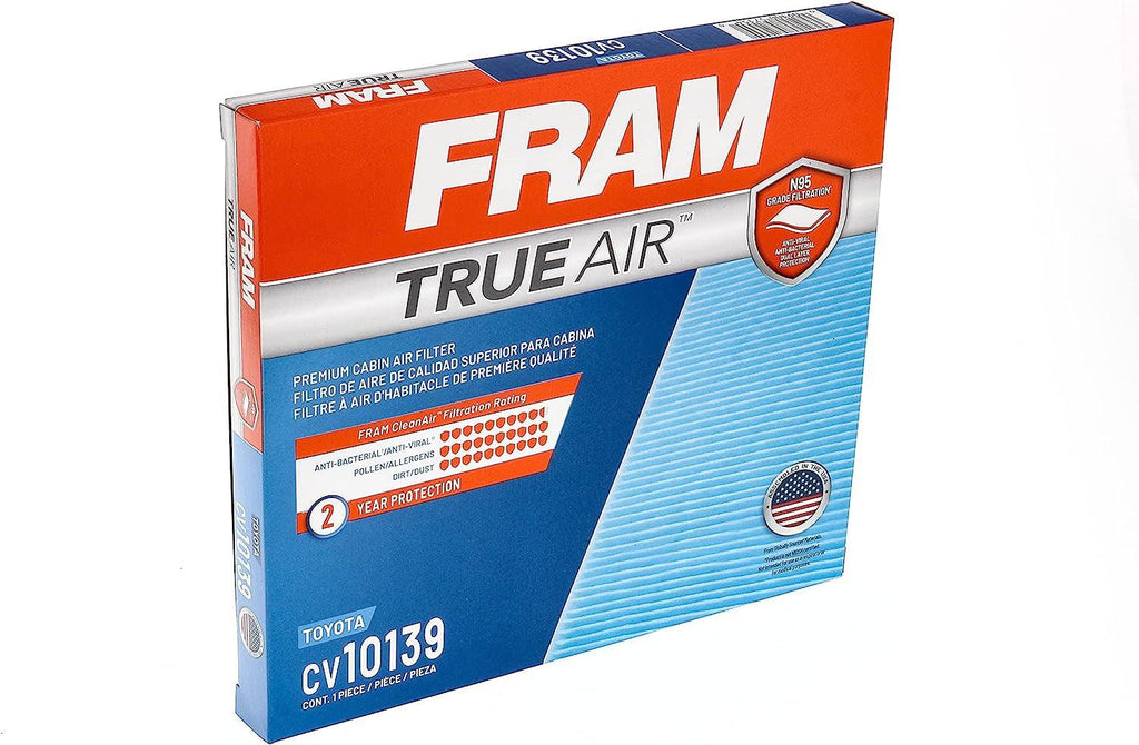 FRAM TrueAir⢠premium cabin air filters feature an innovative, dual-layered filter media that protects against harmful air travel pollutants. Its dual-layered media offers proven particle protection by capturing 95% of air travel particles, as small as 0.3 microns. With an additional layer of protection, FRAM TrueAir⢠filters out 99% of dirt, dust, and pollen, keeping the air in the vehicleās cabin clean.
