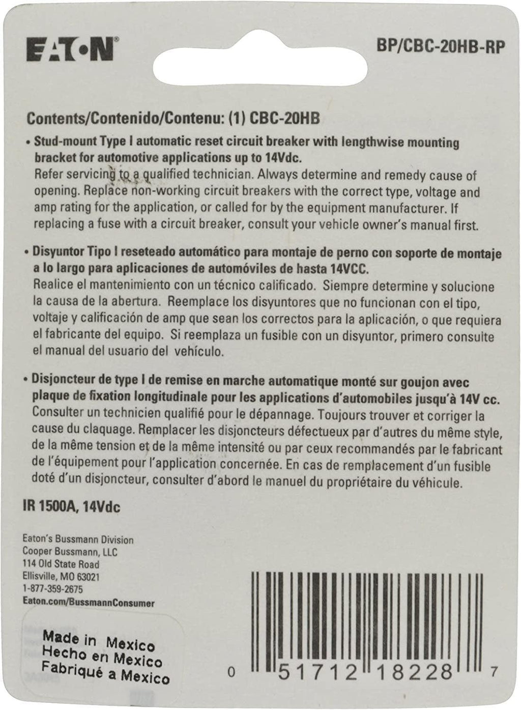 Bussmann Type-I 12 Volt DC Circuit Breaker comes with two 10-32 threaded studs and crosswise bracket. Bussmann stud-type circuit breakers feature patented fail-safe technology, and are available in various mounting configurations. Complies with SAE standard J553.