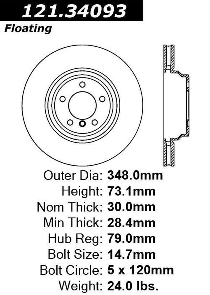 Specifications: Part Category: Disc Brake Rotor Brand: Centric Manufacturer Part Number: 121.34093 Vehicle Position: Front Placement on Vehicle: Front Label: C-TEK Standard Disc Brake Rotors Product Type: Factory Replacement Type: Disc Brake Rotor Number of Pieces: 1 Discard Thickness: 1.118 Discard Thickness: 28.400 Nominal Thickness: 1.177 Nominal Thickness: 29.900 Overall Height: 2.886 Overall Height: 73.300 Outside Diameter: 13.701 Outside Diameter: 348.000 ABS Tone Ring Included: No Surface Type: Smooth Solid Or Vented Type Rotor: Vented Bearings Included: No Center Hole Diameter: 3.106 Center Hole Diameter: 78.900 Mounting Bolt Hole Circle Diameter: 120.000 Mounting Bolt Hole Circle Diameter: 4.724 Stud/Lug Hole Quantity: 5 Stud/Lug Hole Diameter: 0.575 Stud/Lug Hole Diameter: 14.600 Disc Mounting [cntrc]: Floating Misc Holes [cntrc]: 1 Vane Style [cntrc]: Straight Weight [cntrc] kgs: 11.000 Weight [cntrc] lbs: 24.200 Important Information: